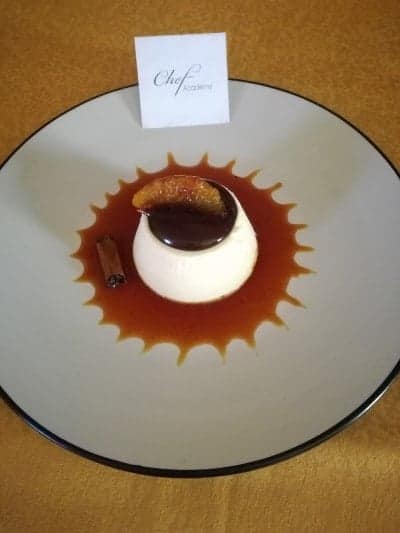 Portare il latte e la scorza ad ebollizione in un pentolino.Nel frattempo sbattere i tuorli con lo zucchero e lo zenzero.A parte mettere la colla di pesce in ammollo in poca acqua fredda.Quando il latte avrà raggiunto il bollore,spegnere e filtrare.Aggiungere 2/3 sul composto di uova sempre mescolando.Amalgamare e aggiungere il tutto al resto del latte nel pentolino.Riporre sul fuoco e sempre mescolando portare a 82°c.Togliere la crema dal fuoco e strizzare la colla di pesce e aggiungerla alla crema(sotto i 60°c)Montare la panna morbida e soffice (non va montata troppo)Aggiungere l’olio d’arancia e poco per volta aggiungerla alla crema e mescolare con una frusta delicatamente per non smontare il composto.Versare il composto negli stampini e riporre in frigo per circa 2 ore. CARAMELLO:mettere lo zucchero in una casseruola.Lasciare sciogliere a fuoco medio senza mescolare.Quando comincerà a scurirsi aggiungere la cannella.Mescolare ,togliere dal fuoco e versare su ogni pezzetto di arancia un po’ di caramello,bagnarli su tutti i lati.Versare l’acqua bollente sul resto del caramello ,mescolare e se necessario continuare sul fuoco finché si e sciolto bene.Trasferire la salsa in un vaso di vetro e aggiungere anche i bastoncini di cannella mescolando ogni tanto . GANACHE AL CIOCCOLATO:portare ad ebollizione la panna.Nel frattempo tagliuzzare finemente il cioccolato.Versare 2/3 della panna sul cioccolato e mescolare,aggiungere il resto della panna e mescolare fino a quando il composto risulterà omogeneo e il cioccolato completamente sciolto. IMPIATTAMENTO:capovolgere lo stampino con la bavarese su un piatto. Versare alla base della bavarese un cucchiaio di caramello e cannella ,mentre sulla sommità un cucchiaio di ganache.Decorare con i pezzettini d’arancia caramellata.