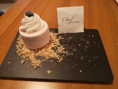 Stroizel alla nocciola: Mettere in planetaria burro e zucchero, unire successivamente le farine setacciate. Sbriciolare il composto e cuocere in forno a 180° per circa 15 minuti. Meringa italiana: Versare in un pentolino acqua e zucchero e portare a 121°. Nel frattempo montare gli albumi. Arrrivati a 121, versare lo sciroppo sugli albumi con planetaria in movimento e girare fino a raffreddamento. Spumoso: Scaldare una parte di yogurt per sciogliere la gelatina. Versare lo yogurt con frutti di bosco sulla meringa e girare. Successivamente aggiungiamo la panna semi-montata girando dal basso verso l’alto. Mettere in una sac a poche, versare nello stampino e abbattere. Mirtilli cristallizzati: Scaldare gli albumi con la gelatina precedentemente idratata ad una temperatura di 30°. Glassare i mirtilli con il composto e stendere su carta assorbente. Quando la gelatina inizierà a tirare, passare i mirtilli nello zucchero semolato.