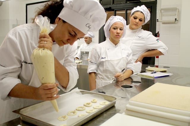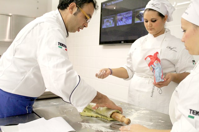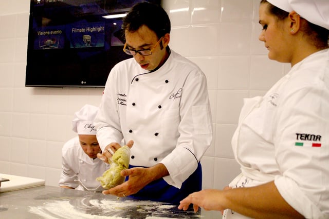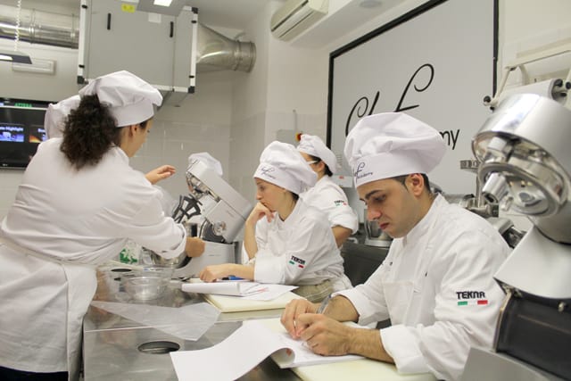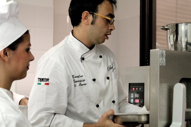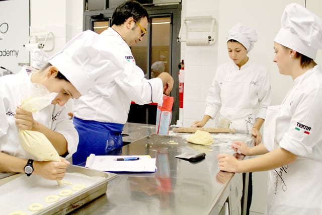 Il corso pasticcere a lavoro con il Maestro Maurizio Di Mario. Realizzazione di dolci base durante le prime lezioni del corso.