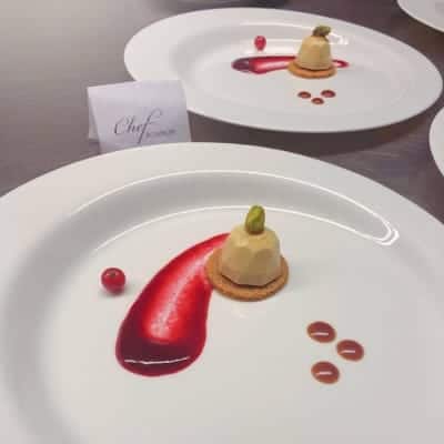Preparare la crema inglese scaldando leggermente il latte,poi unire zucchero e tuorli e portare a 85°c. Far raffreddare fino a 30/35°c . Per la bavarese al pistacchio unire la bavarese con la pasta pistacchio a gusto, poi la colla di pesce ed infine la panna semimontata. Mettere nello stampo della monoporzione per metà. Per la bavarese al caffè stesso procedimento ma aggiungere questa volta la pasta caffè a gusto e riempire l’altra metà dello stampo. Per la frolla bretone montare zucchero e burro, unire sale, tuorli e farina e baking setacciati insieme. Stendere su carta da forno e infornare a 170° per circa 20minuti. Sfornare e coppare subito i cerchietti prima che si raffreddi e quindi che si indurisca. Preparre il caramello salato: fare caramellare lo zucchero, decuocere con la panna, poi unire burro e sale. Una volta raffreddato comporre la monoporzione: disco di frolla, una punta di caramello salato e sopra la bavarese a due strati. Decorare con un pistacchio, gocce di caramello salato e coulis di lamponi (cuocere polpa lampone e zucchero e raffreddare).