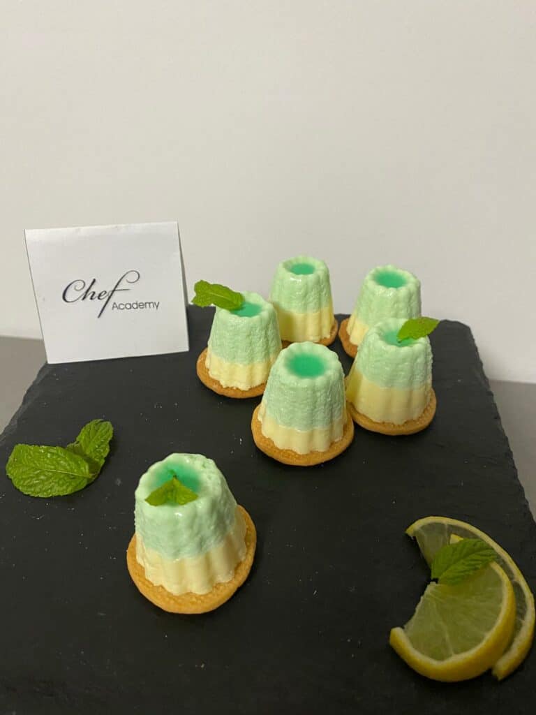Montaggio del dolce: sformare le bavaresine e disporle sul disco di frolla concludere con il geleè alla menta.