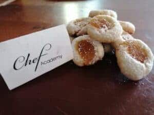 Setacciare i tuorli sodi. In planetaria aggiungere la farina, la fecola e il burro morbido. Aggiungere lo zucchero a velo, gli aromi e i tuorli sodi. Fare una palla, avvolgerla nella pellicola e fare riposare in frigo per circa 1 ora. Fare delle palline da circa 3 cm, leggermente schiacciate e con una fossetta al centro riempita di confettura di fichi. Posizionare i biscotti su una teglia con carta forno e cuocere a 170°C per 15 minuti.