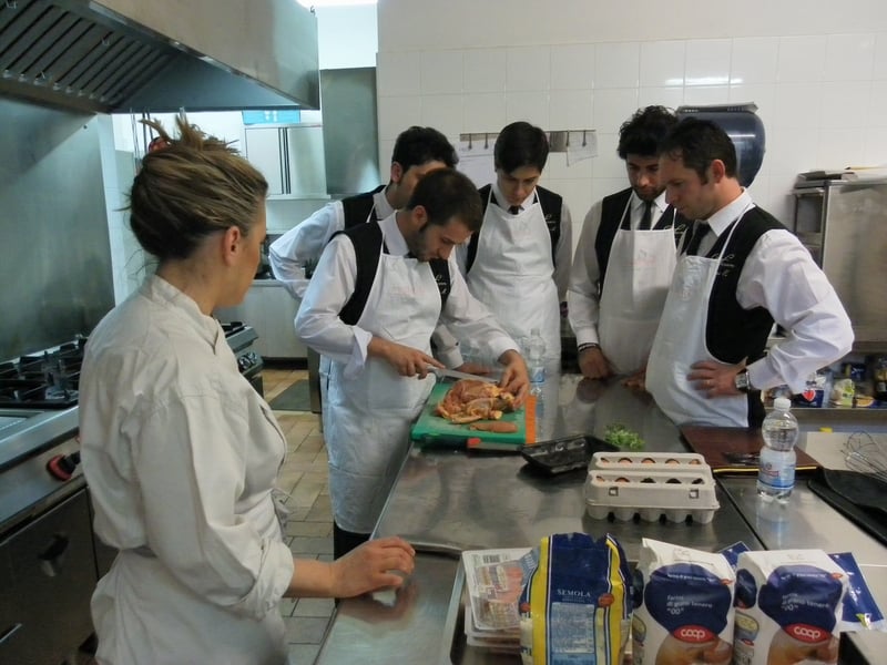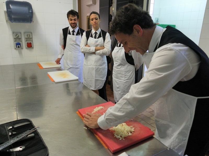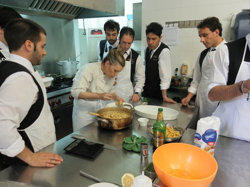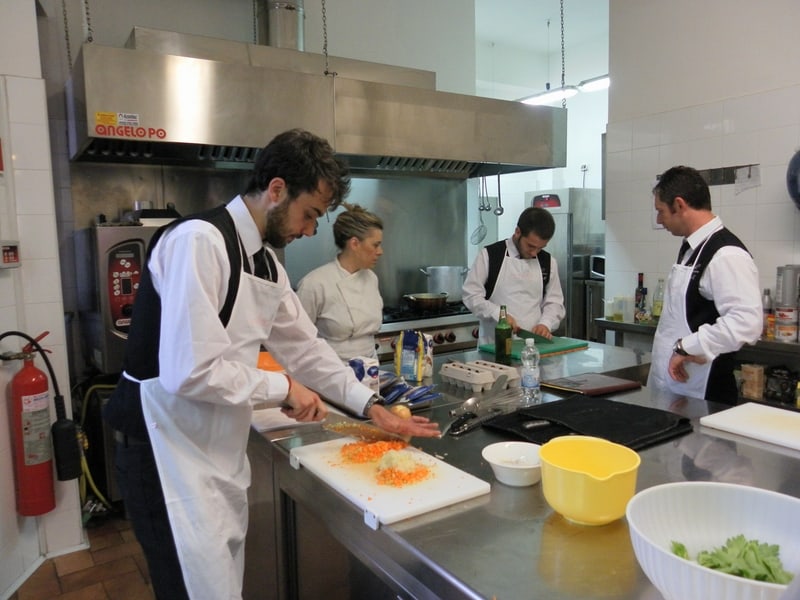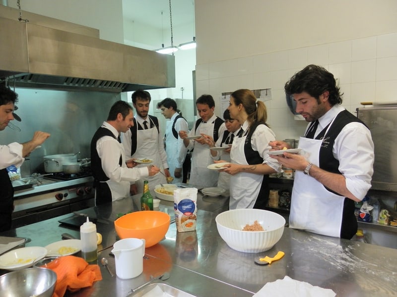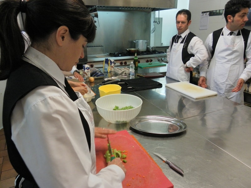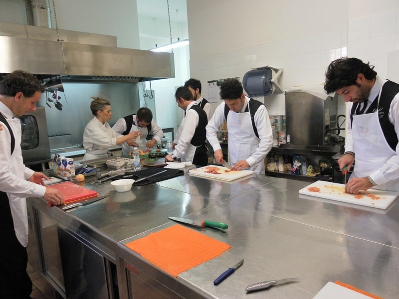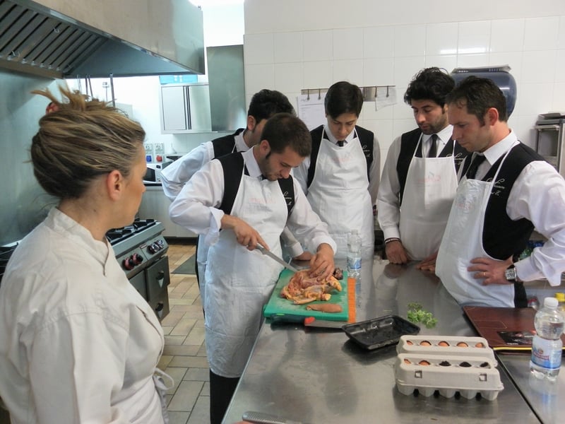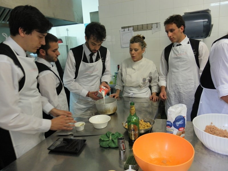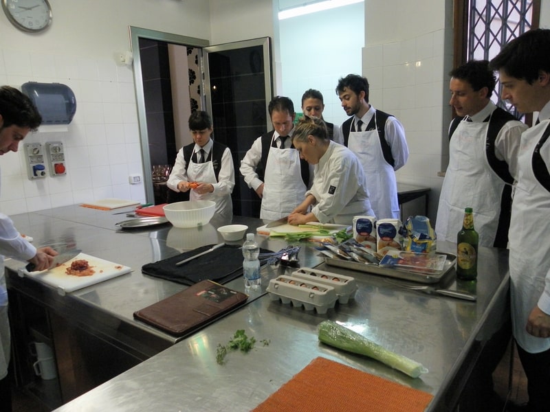 Gli allievi del corso ‘Addetto qualificato di sala ristorante’ (MAÎTRE) alla loro seconda ed ultima lezione in cucina con la Chef stellata Iside de Cesaredel ristorante ‘La Parolina’ .
