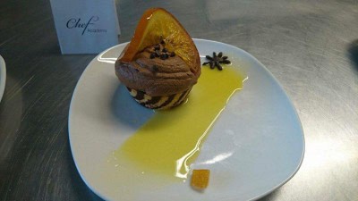 -frolla Milano: Montare in planetaria burro, zucchero, uova e un pizzico di sale e per ultimo aggiungere la farina, mescolando per ottenere un impasto cremoso. Dividere in due parti uguali l’impasto e in uno aggiungere l’amido e l’aroma all’arancia, nell’altra ,età il cacao. Trasferire i due composti in due sac a poche e andare a creare dei gusci di pirottini di alluminio passati con lo staccante, alternando i composti in modo da ottenere un effetto bicolore. Cuocere in forno preriscaldato a 170 per circa 10-15 minuti. -biscuit: Montare a neve gli albumi con lo zucchero e il pizzico di sale, unire poi i tuorli e per ultimo il cacao. Trasferire subito il composto in su una placca con carta forno e cuocere per 5minuti a 200gradi. Una volta raffreddato, coppare dei dischetti che andranno sul fondo della frolla, inzuppati con la bagna all’arancio. -spremere 200 grammi di succo d’arancia e filtrarlo; tenerne 50 g da parte per la mousse e i 150g restanti mettere in un pentolino con anice stellato in infusione. -meringa italiana: in un pentolino portare lo sciroppo di acqua e zucchero a 121 gradi; in contemporanea, una volta raggiunti i 110 gradi cominciare a montare gli albumi a neve. Quando si è raggiunta la temperatura, aspettare un momento che lo sciroppo non faccia più bolle e versarlo a filo negli albumi mentre vengono montati fino a quando il composto si raffredda. -montare 200g di panna, lucida e dividerne 150 e 50 -mousse: Emulsionare il succo di arancia con la meringa italiana, incorporare la colla di pesce sciolta in acqua al microonde e per ultimo incorporare la panna semimontata. Trasferire il composto in un sac a poche. Nel frattempo sciogliere al microonde il cioccolato fondente, creare un’emulsione con la meringa, gira to energicamente con la frusta e per ultimo incorporare la panna semimontata. Trasferirla in un sac a poche. Andare a comporre il dolce, mettendo nei gusci di frolla un dischetto di biscuit bagnato, un cuore di mousse all’arancia con dadini di arancia fresca, chiudere con uno strato di mousse al cioccolato e gocce di cioccolato. Coprire con una arancia candita ed accompagnare con la salsa all’anice che si prepara scaldano il succo di arancia con lo zucchero e il succo di limone e a cui si aggiunge in ultimo uno o due cucchiai di amido di mais per renderlo più consistente