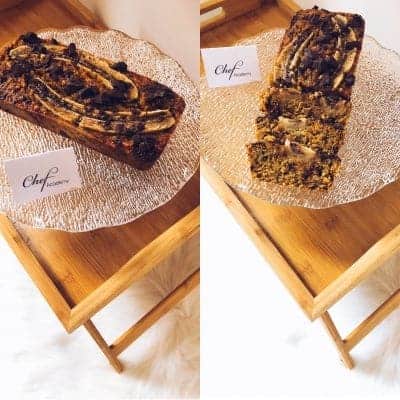 Tagliare due banane a fettine e cuocerle insieme allo zucchero fino a quando non si forma un caramello. Mettere in planetaria e unire uova, olio di cocco e le polveri. A fine le scaglie di cioccolato a seconda della quantità desiderata. Con l’ultima banana creare una decorazione da appoggiare sopra la torta tagliandola a metà per la lunghezza. Cuocere a 170° per 30 minuti.