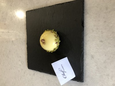 Per il Bisquit al pistacchio montare in planetaria tuorli albumi e zucchero fino ad ottenere un composto spumoso, aggiungere le polveri setacciate mescolando dall’alto verso il basso, aggiungere infine la pasta di pistacchio. Versare il composto in una teglia con carta forno e cuocere a 200 gradi per circa 10 minuti. Preparare la crema pasticcera, aggiungere la colla di pesce ,mescolare e incorporare la panna semi montata. Separare 75 grammi di composto e aggiungere la pasta di pistacchio per il cuore. Versare il composto per il cuore su stampi in silicone di piccole dimensioni. Inserire gli stampi in congelatore, Quando i cuori al pistacchio hanno assunto una loro consistenza, versare la crema bavarese alla vaniglia negli stampi a cupola e inserire all’interno i cuori e il biquit coppato rotondo. Riporre le cupole in congelatore. Nel frattempo preparare la glassa al cioccolato bianco, mettendo sul fuoco acqua, zucchero glucosio e panna e portare a 102 gradi centigradi. Togliere dal fuoco, fare raffreddare e aggiungere il cioccolato bianco, riportare sul fuoco per qualche secondo per consentire al cioccolato bianco di diventare liquido, fare raffreddare e aggiungere la gelatina e la colla di pesce. Riprendere le bavaresi dal congelatore, posizionarle su una griglia con sotto una teglia, versare la glassa al cioccolata bianco e lasciare colare per qualche secondo, decorare il bordo con granella di pistacchio e pistacchi interi.