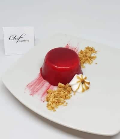 Mettere la gelatina a idratarsi in acqua fredda (acqua cinque volte il peso della gelatina) e nel frattempo scaldare 50 g di panna in cui sciogliere la gelatina. Prendere 75 g di meringa all’italiana preparata precedentemente e incorporare la panna con la gelatina che nel frattempo si è freddata, aggiungere poi la restante panna montata. Infine, aggiungere il pepe rosa q.b.