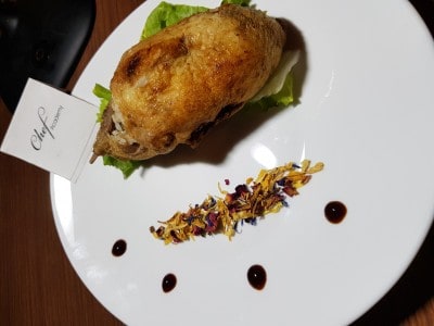Eviscerare e pulire le piume in eccesso del piccione,lasciar marinare il piccione per 6 ore con olio sale pepe e Aromi Vari (bacche di ginepro, alloro, rosmarino) coprire con la pellicola. Trascorse le 6 ore lavare accuratamente il Riso e farcire il pollo, cucire la cavità anale con del filo da cucina e legare con dello spago le cosce del piccione. mettere in una teglia con sedano carota cipolla e infornare a 160° per 45 minuti . Trascorsi 15 minuti innaffiare con abbondante vino bianco e coprire con la carta stagnola avendo cura di nappare tutte le parti del piccione. Nel frattempo montare i tuorli con una frusta aggiungendo l olio a filo e una volta che il composto sarà denso versare l’aceto e il peperoncino triturato in polvere. Per impiattare formare 4 gocce con la salsa piccante al lato sinistro del piatto formare una striscia di fiori edibili acanto alla salsa e adagiare il piccione su una foglia verde di lattuga.