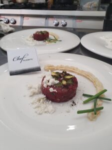 Cominciamo a tritare finemente la carne di manzo con un trinciante e amalgamare bene in una ciotola con olio evo, fior di sale, timo, pepe. Coprire e lasciar riposare in frigo. Mettiamo a bollire le patate e le carote. Nel frattempo iniziamo a preparare la maionese di pistacchio aiutandoci con una frusta unendo pasta di pistacchio, tuorli e andando ad aggiungere a poco a poco l’olio, succo di limone, sale e aceto di vino bianco. Un poco d’acqua se necessario. Prepariamo la polvere d’olio aiutandoci con la maltodestrina, che é una stabilizzante che lega i grassi e cambia la loro struttura. Tostiamo leggermente i pistacchi. Infine quando sono pronte prepariamo il puré di patate e carote unendole a fuoco basso in una casseruola,aiutandoci con la frusta,con il latte, burro poco alla volta, sale e per finire l’olio evo. Siamo pronti per impiattare in un piatto piano.