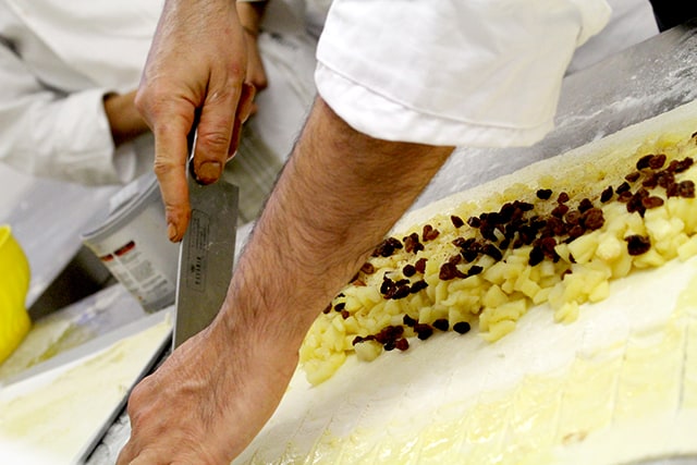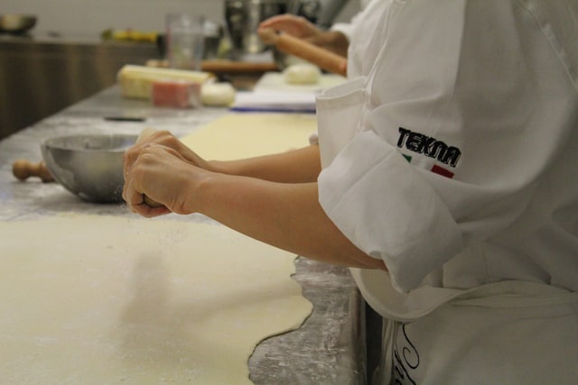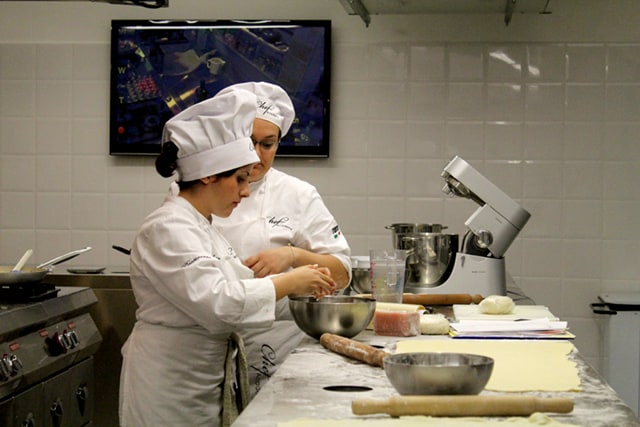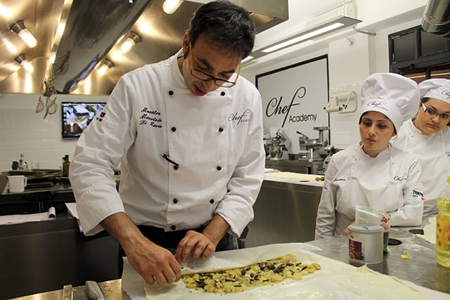 Il Maestro Maurizio Di Mario insegna agli allievi del Corso Pasticcere le tecniche necessarie per la realizzazione di prodotti in pasta sfoglia.