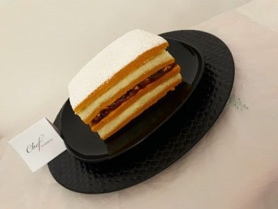 Torta con impasto al pomodoro, farcitura al semolino e confettura di prugne e noci