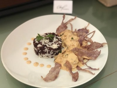 Tagliate il vitello a cubetti, privatelo dei nervi ed il grasso. • In una pentola, scaldate l’olio, versate la cipolla tagliata a cubetti e fatela imbiondire senza però dorare. • Aggiungete l’aglio, l’origano, il pepe ed i dadini di pollo. Cuocete a fuoco medio, mescolando ogni tanto, finché il pollo diventa dorato. • Aggiungete i piselli e l’alloro e lasciate cuocete per qualche minuto. Aggiungete il mais privo del liquido di conserva ed i funghi (io non li ho usati ma la ricetta originale li prevederebbe). Fate cuocere per 10 minuti circa. • Aggiungete la panna e il concentrato di pomodoro. Cuocete per circa 5 minuti, aggiungete il latte di cocco e fate restringere un po’ la salsa fino alla consistenza che preferite. • Servite caldo insieme al riso bianco e con delle patate fritte di viola.