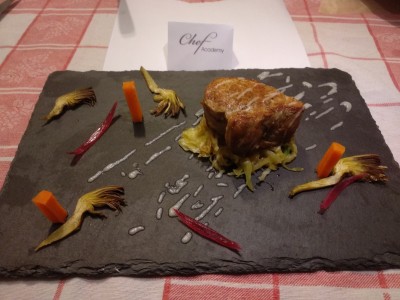 Tagliare le carote a bastoncini lunghi 3 cm e larghi 1cm e le cipolle al carpione e metterli in un pentolino con acqua, aceto e zucchero e lasciar cuocere per 5 minuti e dopo togliendo dal fuoco lasciare nel pentolino per altri 7 minuti, dopodichè scolarli e asciugarli. In una padella soffriggere le cipolle perr 40 secondi con olio e poi mettere i crauti e saltarli per 10 minuti finchè non iniziano ad ammorbidirsi, mettere sale e zucchero e dopo 2 minuti sfumare con la birra e lasciarli cuocere altri 10 minuti fino a quando non avranno assorbito tutto il liquido e quindi essere cotti. Prepariamo la crema di pere e pecorino tagliando le pere a cubetti da 1 cm e lasciandole cuocere per 20 minuti in acqua bollente fino a quando non saranno morbide da sfaldarsi e e che l’acqua non si sia ritirata del tutto, dopo frullare insieme al pecorino romano fin quando non si verrà a creare una crema omogenea. Pulire i carciofi, tagliarli finemente e cuocerli saltandoli in padella per 2 minuti con olio e sale, appena pronti asciugarli con carta da cucina. In una padella cucinare il filetto di suino soffriggendo e insaporendo dapprima l’olio con l’aglio e il mazzetto aromatico e poi con il filetto stesso fino a quando la temperatura al cuore non abbia raggiunto i 67°C. Lasciar riposare il filetto all’interno di carta d’alluminio così da rimanere morbido e rilasciando il proprio succo. Servire su un piatto d’ardesia mettendo i crauti in alto a destra, le carote e le cipolle in agrodolce attorno, infine mettere il filetto sui crauti e guarnire con la crema di pere e pecorino.