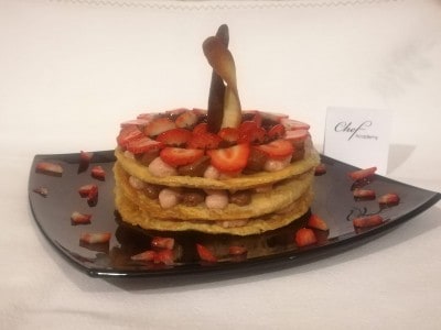 Pasta sfoglia classica:per realizzare il pastello occorre mettere in planetaria dotata di gancio la farina,sale sciolto nell’acqua e burro.Lavorare per qualche minuto fino ad ottenere un composto liscio,che andrà messo in un recipiente coperto da pellicola a contatto per far riposare. Per realizzare il panetto bisogna mettere nella ciotola della planetaria con il gancio,la farina debole e il burro tagliato a cubetti.Lavorare finchè il burro non avrà assorbito del tutto la farina.Trasferirlo su un piano infarinato e dargli una forma quadrata.Lasciare riposare Stendere il pastello e posizionare il panetto al centro e proseguire con le classiche pieghe(3-4) per la preparazione della sfoglia. Al termine avvolgere il composto steso,nella carta forno e mettere in frigo per almeno 1 ora. Una volta tolto dal frigo,ricavare i 3 cerchi che dovranno essere bucherellati prima di essere infornati.Cuocere a 180° forno statico preriscaldato per circa 40-50 min. Crema pasticcera alle fragole:frullare 150 g di fragole.In un pentolino mettere a scaldare il latte con le bucce del limone.Preparare il pastello di tuorlo,zucchero e amido di mais.Quando il latte si sarà scaldato ,filtrarlo e versarlo nel pastello.Rimettere sul fuoco basso,versare le fragole frullate e mescolando far addensare.Spegnere il fuoco e far raffreddare. Crema pasticcera al cioccolato:.In un pentolino mettere a scaldare il latte.Sciogliere a bagnomaria il cioccolato.Preparare il pastello di tuorlo,zucchero e amido di mais.Quando il latte si sarà scaldato ,versarlo nel pastello.Rimettere sul fuoco basso,versare il cioccolato .Mescolare e far addensare.Spegnere il fuoco e far raffreddare. Biscotti bicolore cialda bianca:in planetaria lavorare il burro con lo zucchero,poi aggiungere l’albume e infine la farina setacciata.Mettere nella sac a poche Biscotti bicolore cialda nera:in planetaria lavorare il burro con lo zucchero,poi aggiungere l’albume e infine la farina setacciata con il cacao.Mettere nella sac a poche Su una teglia con carta da forno creare i biscotti a forma di V e infornare a 180° per pochi minuti,fino a leggera doratura.Una volta tolti dal forno,velocemente avvolgerli su se stessi Assemblare la torta alternando a proprio piacere i dischi di sfoglia con ciuffi delle creme alternate,in superficie completare con le creme,le fragole a fettine lucidate con gelatina e gli “Amanti”