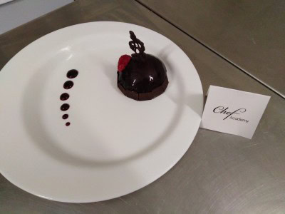 PROCEDIMENTO: CREMA INGLESE: in una ciotola mettiamo lo zucchero, il tuorlo e la vaniglia. Portiamo ad ebollizione il latte ed uniamo al composto. Mettiamo il composto sul fuoco e raggiungiamo la temperatura di 85°C. BAVARESE AL CIOCCOLATO BIANCO: nel frattempo mettiamo in ammollo la gelatina, quando la crema inglese ha raggiunto la temperatura degli 85°C togliamo dal fuoco ed aggiungiamo la gelatina strizzata, ed infine il cioccolato. Quando il composto arriva a 30°C aggiungiamo la panna semi montata. INSERTO AI LAMPONI: prendiamo una parte di polpa di lamponi e l’amalgamiamo con il succo del limone e scaldiamo al microonde, una volta scaldata aggiungiamo la gelatina strizzata precedentemente messa in ammollo in acqua. La parte restante di polpa la mescoliamo con lo zucchero a velo. Uniamo i due composti ed versiamoli nell’appositi stampi , mettiamoli in abbattitore. BISCUIT AL CACAO: montiamo gli albumi con lo zucchero, una volta montati aggiungiamo a mano i tuorli con il cacao setacciato. Cuociamo a 200 °C per 5 minuti circa. GLASSA AL CIOCCOLATO: scaldiamo l’acqua, la panna e lo zucchero, una volta caldo aggiungiamo il cacao e portiamo ad una temperatura di 101°C appena raggiunta la temperatura togliamo dal fuoco. Quando il composto arriva alla temperatura di 60°C aggiungiamo la gelatina strizzata precedentemente messa in ammollo. Far riposare. COULIS AI FRUTTI DI BOSCO: mettiamo in una pentola tutti gli ingredienti, il composto è pronto quando si è addensato. Per il montaggio: versiamo metà composto della bavarese al cioccolato bianco nello stampo, mettiamo l’inserto e ricopriamo con la restante bavarese e chiudiamo con il bisquit, mettiamo in abbattitore. Quando la bavarese è ben fredda ricopriamola con la glassa al cioccolato e decoriamo il piatto con il coulis ai frutti di bosco.