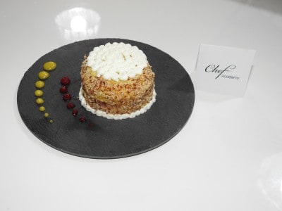 PAN DI SPAGNA: mettiamo nella planetaria le uova, lo zucchero, i tuorli il sale e la vaniglia ed azioniamo, quando il composto è spumoso e di colore chiaro aggiungiamo la farina setacciata con la marisa. Versiamo negli stampini e cuociamo a 170° per circa 25 minuti. CREMA AI LAMPONI: in una ciotola amalgamiamo lo zucchero con i tuorli e l’amido di mais setacciato, mettiamo sul fuoco la polpa di lamponi ed aggiungiamo tutto il composto della ciotola, la crema è pronta quando arriva a una temperatura di 85°. CREMA AL LIMONE: in un pentolino mettiamo tutti gli ingredienti, mettiamo sul fuoco e la crema è pronta quando raggiunge la temperatura di 85°. BAGNA: sciogliamo sul fuoco acqua e zucchero, facciamo freddare. MONTAGGIO: bagniamo il pan di spagna, facciamo uno strato di crema ai lamponi alternato ad un altro strato di pan di spagna bagnato e con crema al limone. Decoriamo con ciuffetti di panna e granella di nocciole.