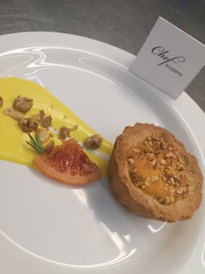 -Frangipane all’arancia: impastare tutti gli ingredienti insieme. -Caramello alle noci: sciogliere in un pentolino acqua, zucchero, dopo aggiungere le noci tostate e il sale, cuocere fino all’imbrunimento dello zucchero. -Frangipane all’arancia: impastare tutti gli ingredienti insieme. -Frolla viennese: impastare in planetaria burro,zucchero a velo, albumi, un pizzico di sale e la vaniglia e in un secondo momento aggiungere la farina e la polvere di mandorle e continuare ad impastare fin quando il composto non risulterà abbastanza morbido da poterlo mettere nei pirottini con l’aiuto di una sache a poche, poi mettere alla base le noci salate, poi la crema di marroni e ricoprire con il frangipane all’arancia. Cuocere a 180° per 20minuti circa. -Crema al Cointreau: mettere in infusione la buccia d’arancia nel latte e metà quantità di panna, e portare ad ebollizione. Montare tuorli e zucchero a parte. Aggiungere il cointreau al latte a 82/83°. Quando si fredda aggiungere la metà restante di panna semi-montata alla crema.
