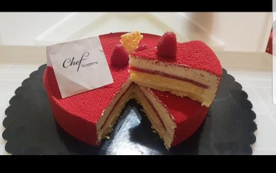 Palet al lampone: scaldare una parte di purea con lo zucchero e sciogliervi la gelatina reidratata. Aggiungere la purea fredda e versare in uno stampo in silicone o nello stesso anello utilizzato per frolla e pan di spagna. Congelare.