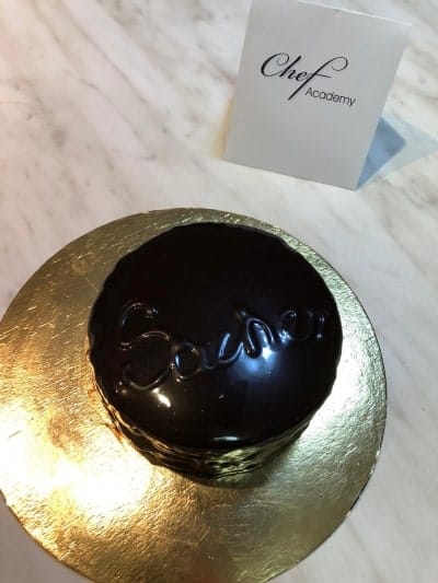 La sacher è un dolce tipico della tradizione austriaca nata  un apprendista pasticciere di solo 16 anni Franz Sacher.La  stroria narra che il giovane Franz stava sostituendo uno chef ammalato,nella preparazione di un dolce e decise di combinare tra loro il cioccolato e marmellata per creare un dolce delicato e gustoso. Questo dolce ebbe  un gran successo e la torta prese anche il suo nome. La torta consiste in due strati di pasta di cioccolatoleggera con al centro un sottile strato di confetturadi albicoccheo ciliegie. Il tutto risulta ricoperto di uno strato di glassadi cioccolato fondente. In questa versione moderna troviano due biscuit al cacao,croccantino,geleè di albicocche e una bavarese al cioccola