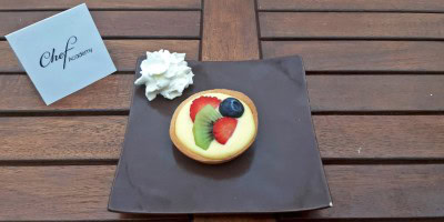 per la frolla: sabbiare farina, burro e sale, aggiungere lo zucchero a velo e poi a filo le uova intere. stendere, mettere su degli stampini e cuocere a circa 180°C per 10 minuti. per la crema: In un pentolino sul fuoco unire latte panna e metà dello zucchero, nel frattempo fare un pastello con amido di riso e di mais, il restante zucchero e il tuorlo d’uovo. Quando il latte bolle unirne la metà nel pastello e girare velocemente con una frusta, riunire il tutto sul fuoco e portare a 82°C, levare dal fuoco stendere su una teglia, mettere in abbattitore per far freddare velocemente. Riempire i fondi di frolla con la crema e guarnire con la frutta.