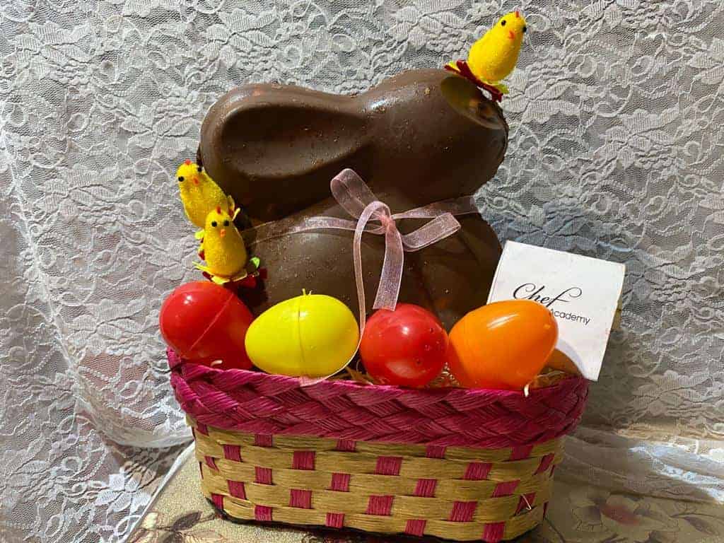 Sciogliere il cioccolato al latte al microonde o a bagnomaria. Poi temperate il cioccolato raffredandolo a 30°e quando è arrivato a temperatura inserirlo nello stampo. Metterlo un pò in abbattitore a negativo per farlo solidificare. Poi quando il primo strato si è solidificato procedere a sciogliere il cioccolato per il secondo strato, in questo caso il cioccolato bianco. Temperarlo a 29° inserirlo nello stampo e metterlo in abbattitore per raffeddarlo. Fate la stessa cosa con l’altro lato del coniglio, quando i due lati sono pronti, prendere una pentola fare bollire l’acqua e mettere sopra una teglia in metallo, appoggiare una parte del coniglio per sciogliere un pò l’estremità in modo da poter attaccare le due parti del coniglio insieme.
