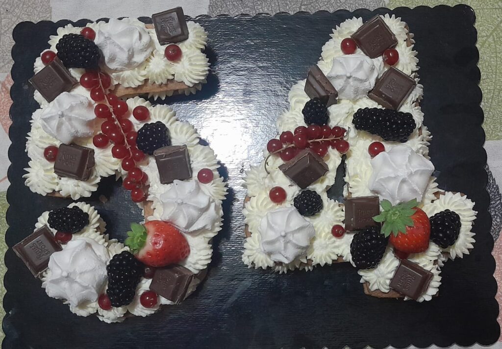 Prendere un vassoi, per il dolce, Prendere i numeri cotti, in questo caso 5 e 4, mettere un po di Crema sotti i numeri così non si muovono, fare tutti i ciuffetti sopra i numeri, uno vicino l’altro, posizionare l’altro 5 e l’altro 4 sopra e ripetere, tutti ciuffetti, in fine decorare con meringhe, cioccolatini e frutta.