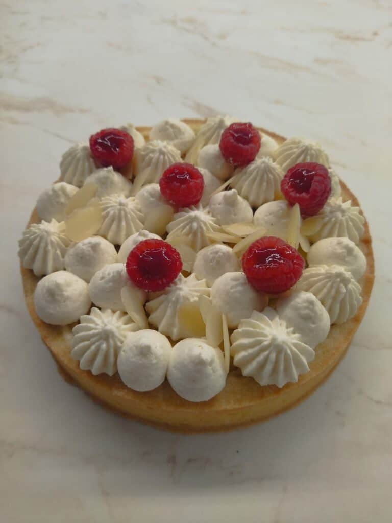 Stendere guscio di frolla, inserire strato di confettura di lamponi e sopra il frangipane. Cottura 170°. Una volta freddo, montare la namelaka e creare decorazione. Terminare con mandorle a lamelle e lamponi freschi ripieni di confettura.