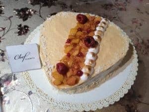 La base è composta da un pandispagna al cocco, ed è composta da tre strati. Il primo strato una mousse allo yogurt, il secondo da un cremoso al mango e il terzo da un cremoso alla papaya. Decorata con mango caramellato, papaya caramellata, meringa italiana flambata, lamponi e ribes.