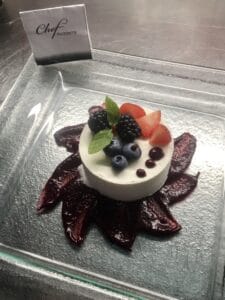 Fantasia di bosco è un dolce composto da una bavarese al cioccolato bianco, un biscotto di frolla e un coulis di frutti di bosco. Decorato poi con frutta fresca.