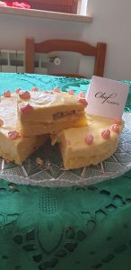 Bavarese al cioccolato bianco con inserto alle banane su una base di pan di spagna