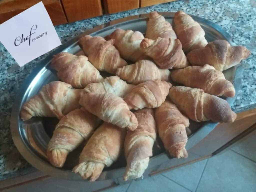 impastare la farina con lo zucchero, lievito, miele, uova e una parte di acqua. Aggiungere il burro in più volte, il sale e la restante acqua in più volte. Quando l’impasto risulta liscio ed elastico pirlare e far lievitare per 12 ore. Una volta lievitato stenderlo e unire il burro piatto e fare 1 piega a 3 e 1 piega a 4, formare i cornetti tagliando tutti triangoli e arrotolarli verso la punta e lasciar lievitare fino al raddoppio. Cuocere a 170° per 12 min.