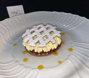 Posizionare i semi della melagrana sul disco di pasta frolla, fare uno strato di crema chantilly con la sac à poche ed in fine adagiare un altro strato di frolla.