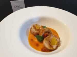 Sul fondo versiamo la crema di peperoni, 3 fette di pollo e qualche goccia di fondo.
