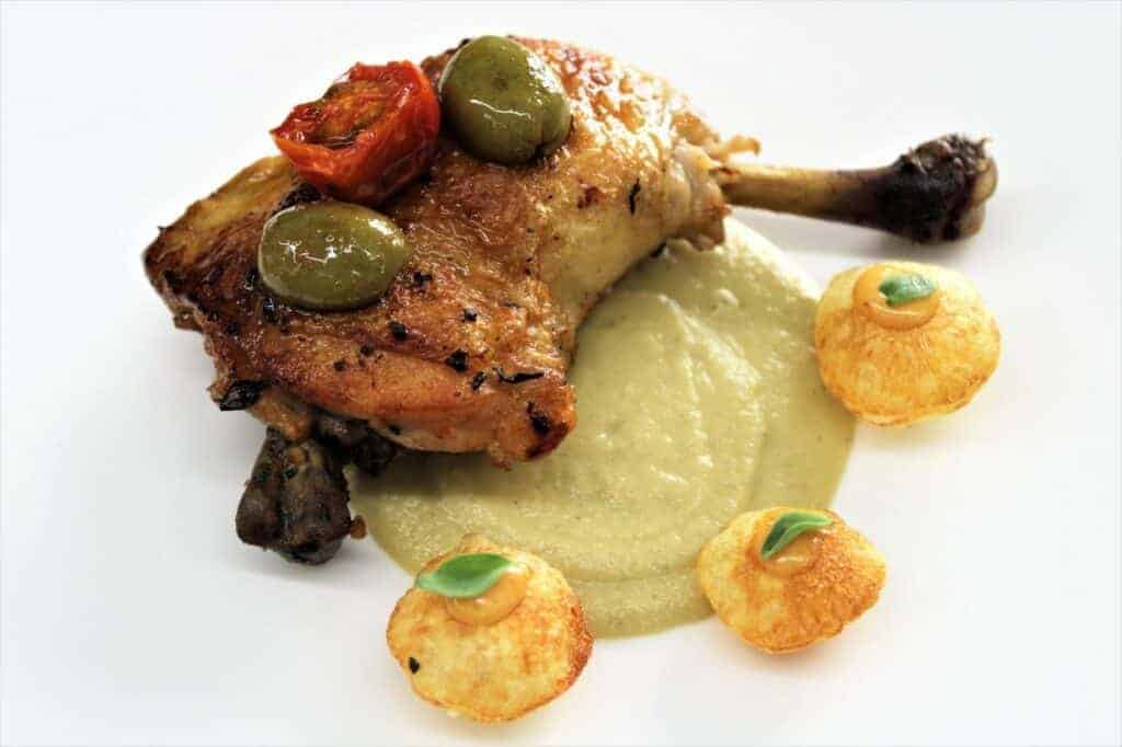 In un piatto piano, disporre alla base la crema di melanzana, sopra la coscia di pollo con le olive e pomodorini. A sinistra del piatto le patate soffiate con sopra la maionese alla paprika e foglie di maggiorana