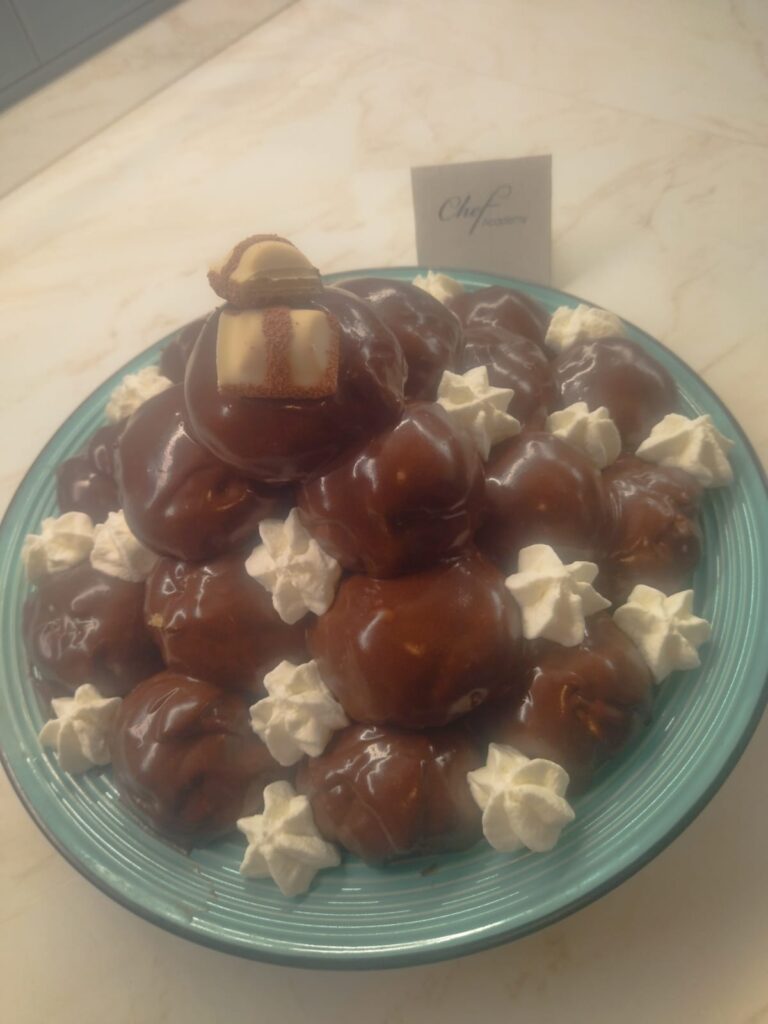 per la pasta choux: acqua, burro, zucchero e sale ad ebollizione. Togliere dal fuoco e aggiungere a pioggia la farina, amalgamando per bene il composto. Lasciare freddare, poi aggiungere un uovo alla volta. Lisciare bene l’impasto e trasferirlo in una sac a poche. Formare i bigne’ e cuocere a 200°per 25/30 minuti.