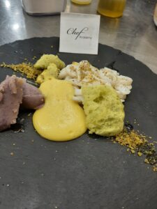 Descrizione:seppia scottata , spugna di fave , crumble di spugna di fave , spuma di patate e curcuma e mantecato di patate viola