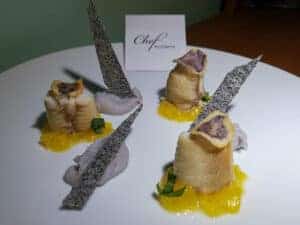 In un piatto piano, mettere il chutney di mango e adagiare sopra i rotolini di trota disposti verticalmente, con una chips di patata viola sopra. Completare il piatto con il mantecato di patate viola, le cialde croccanti di semi di papavero e chiffonade di basilico.