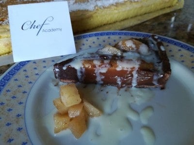 Ottenere un impasto simile alla sabbia miscelando il burro, le polveri e la buccia d’arancia , aggiungere poi lo zucchero e infine le uova far riposare in frigo per 30 minuti c.a. Dopodichè stendere la frolla e foderarci uno stampo apribile e cuocere a 170°. Nel frattempo sbucciare le pere e tagliarle a spicchi per poi irrorarle con il succo di limone. Portare le pere sul fuoco con il vino, la cannella, 40g zucchero. Sciogliere il cioccolato con il burro e a parte montare le uova con lo zucchero rimasto, incorporarci il cioccolato fuso mescolando con la frusta. Versare il composto al cioccolato sulla frolla precotta, guarnire con le pere e cuocere a 180°per 10 minuti c.a