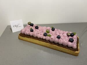 Per la mousse ai mirtilli: idratatare la gelatina in acqua fredda per 10 minuti. Scaldare la polpa con lo zucchero fino ad arrivare a 35°C. strizzare la gelatina, scioglierla al microonde e aggiungerla alla purea, emulsionando con un frullatore ad immersione. Semimontare la panna e aggiungerla in 2-3 volte al composto di purea e gelatina. Versare la mousse nello stampo, sbattere leggermente per eliminare l’aria e mettere in abbattitore.