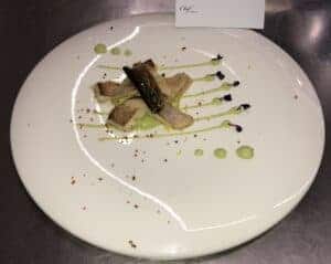 Soffriggere scalogno in olio d’oliva, aggiungere piselli, cuocere per 5 minuti. Frullare e aggiungere mascarpone olio e sale. Friggere la pelle della trota per pochi secondi in olio bollente, Scottare la trota in padella ben calda con olio, adagiare i bocconcini di trota sulla crema di piselli e mascarpone e guarnire con la pelle fritta, la scorza di limone e le alici triturate